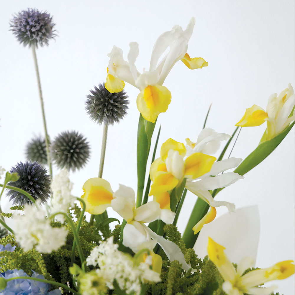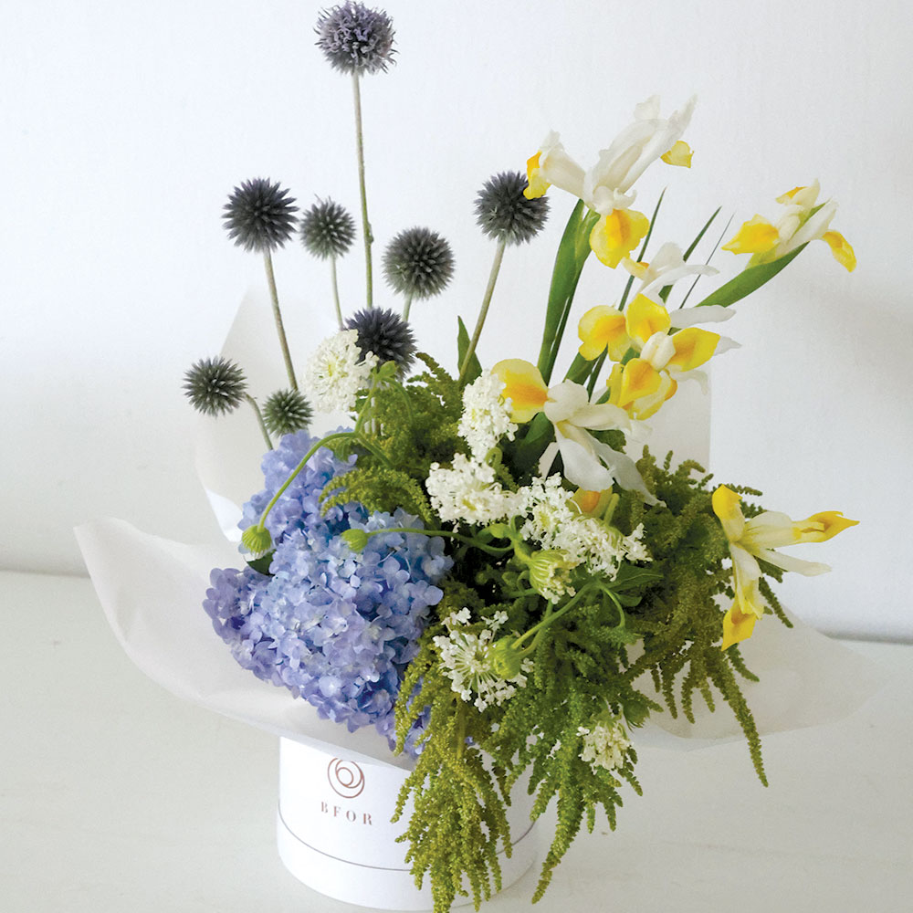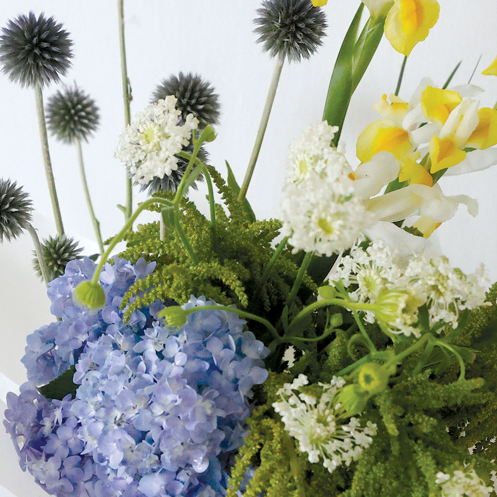 Sky Over Meadow captures the feeling of open skies meeting fields in bloom. With soft blue tones layered against warm, golden accents, this bouquet brings a sense of lightness and quiet joy – like a slow, sunlit morning. Designed with texture and movement, it feels both uplifting and grounded, perfect for celebrating her in a way that’s thoughtful, refined, and effortlessly beautiful.